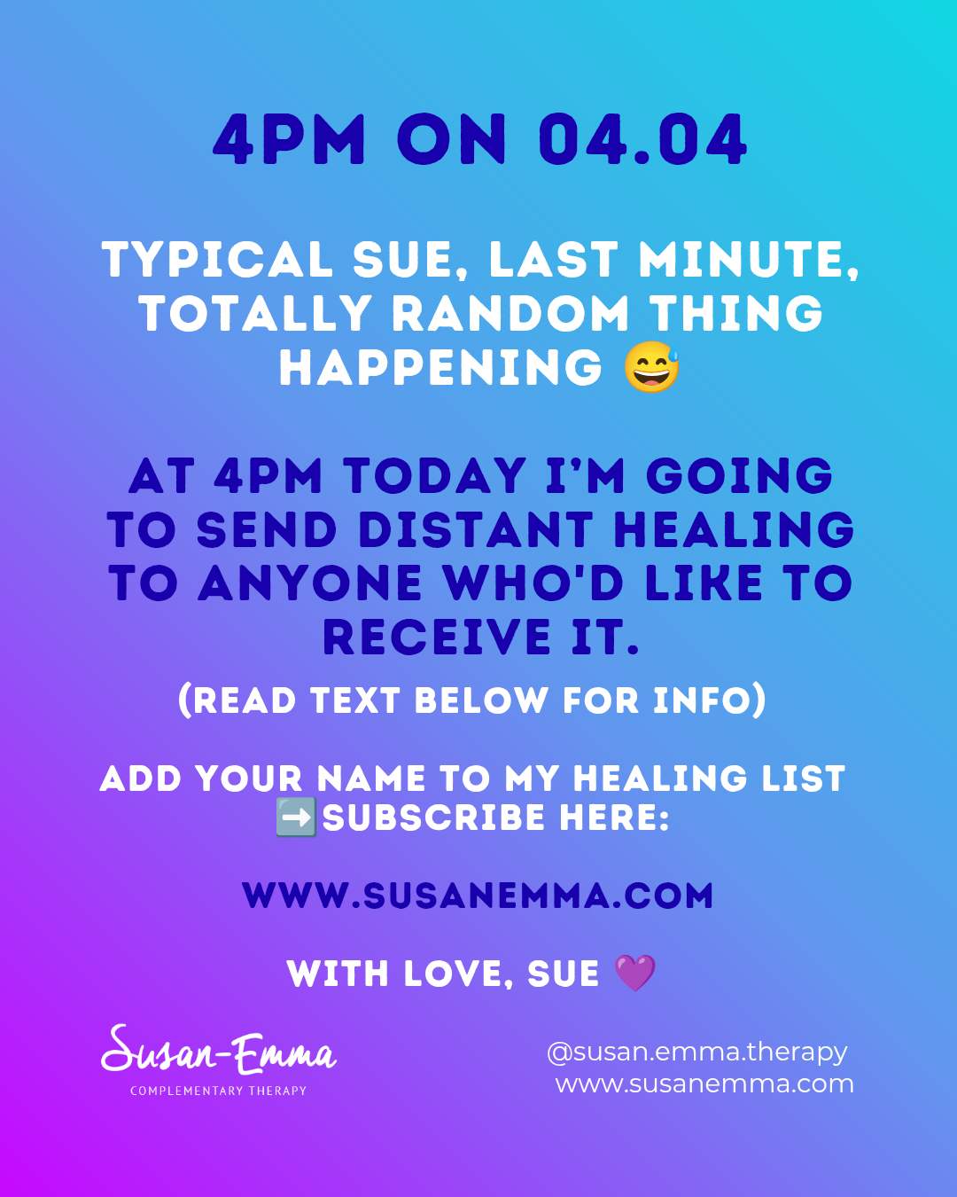 DM me for more info and remember to SUBSCRIBE at www.susanemma.com for your free gift meditation recording.